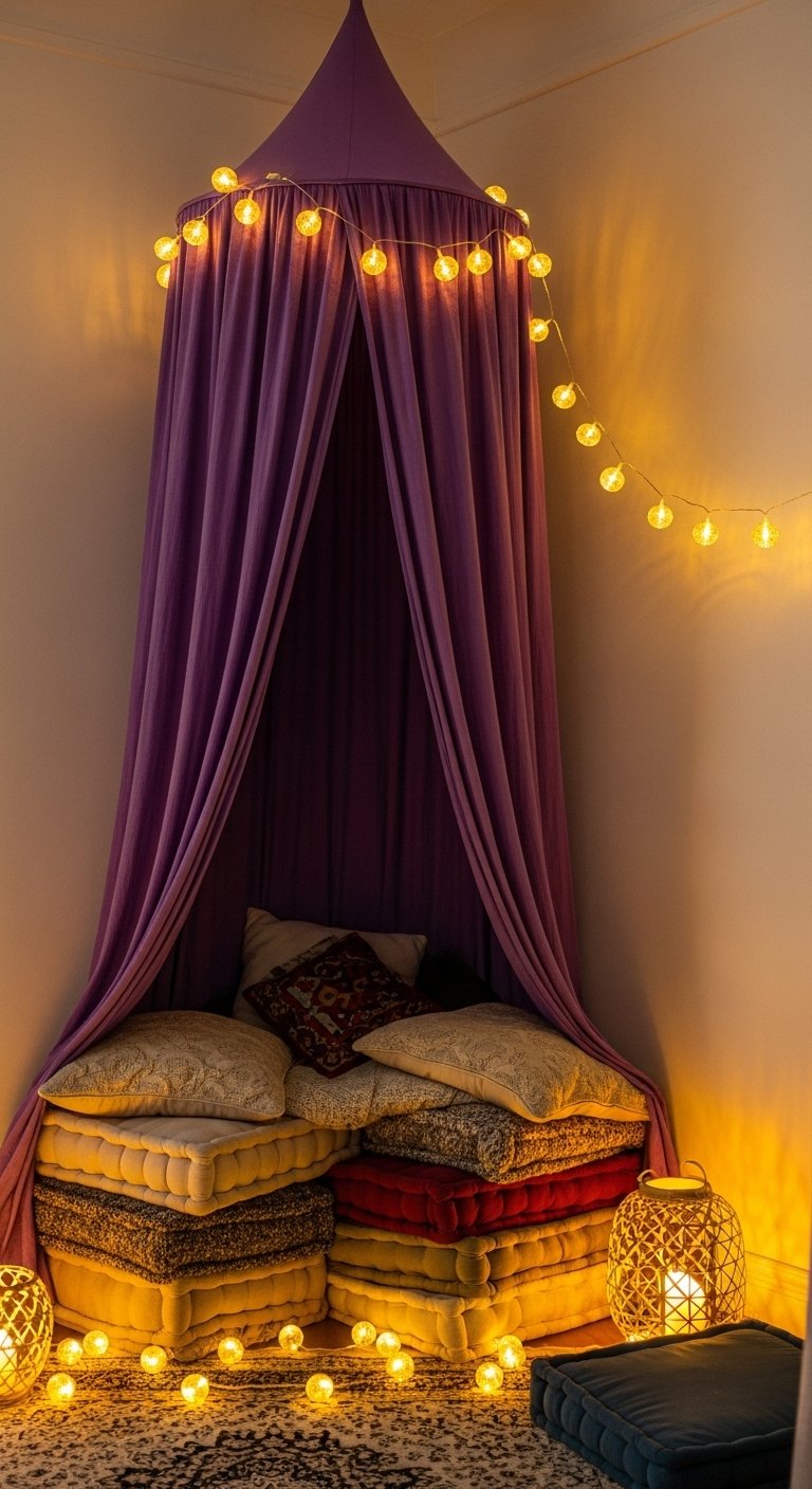 I hung a sheer purple canopy over a cozy chair to carve out a reading nook. A lightweight canopy bed netting in purple plus LED string fairy lights makes it feel private and soft. It’s a small investment that reads luxe. Mistake to avoid: hanging it too low—keep at least 6–8 inches above head height to avoid a cramped feeling.