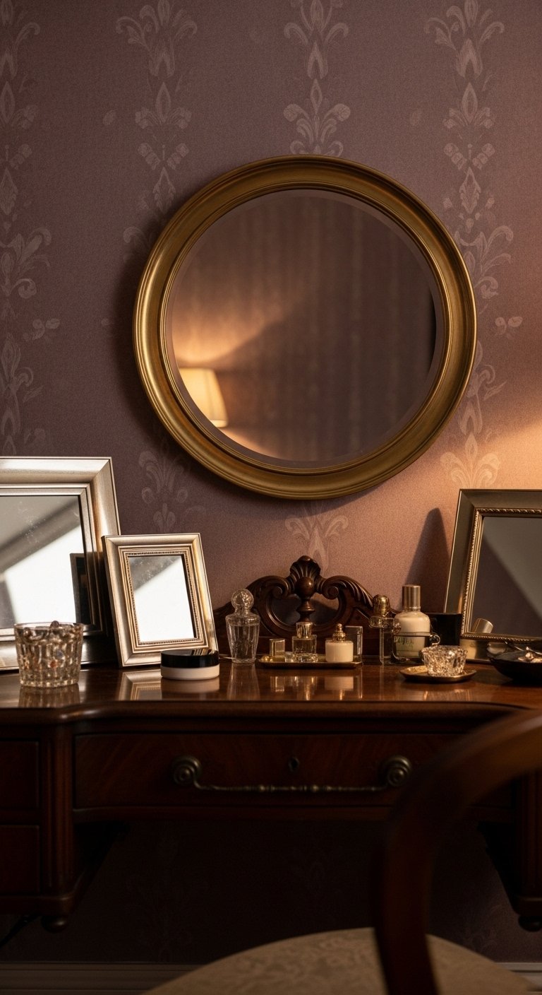 I mixed mauve paint with warm brass accents to add a subtle glam. A 36-inch round gilt mirror above a white dresser brightened a dark corner. Add small gold frames and a mauve rug for balance. Mistake to avoid: overdoing shiny finishes. Keep metallics to an odd-numbered group so they read curated, not cluttered.