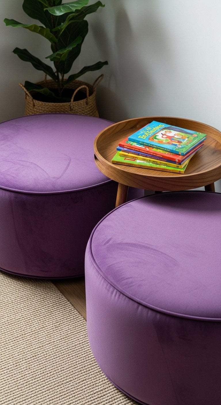 Velvet poufs in purple make seating playful and changeable. I use purple velvet poufs around a low table—perfect for sleepovers. They’re compact and add texture. Mistake to avoid: too many small cushions—three poufs is a comfortable number that keeps flow open.