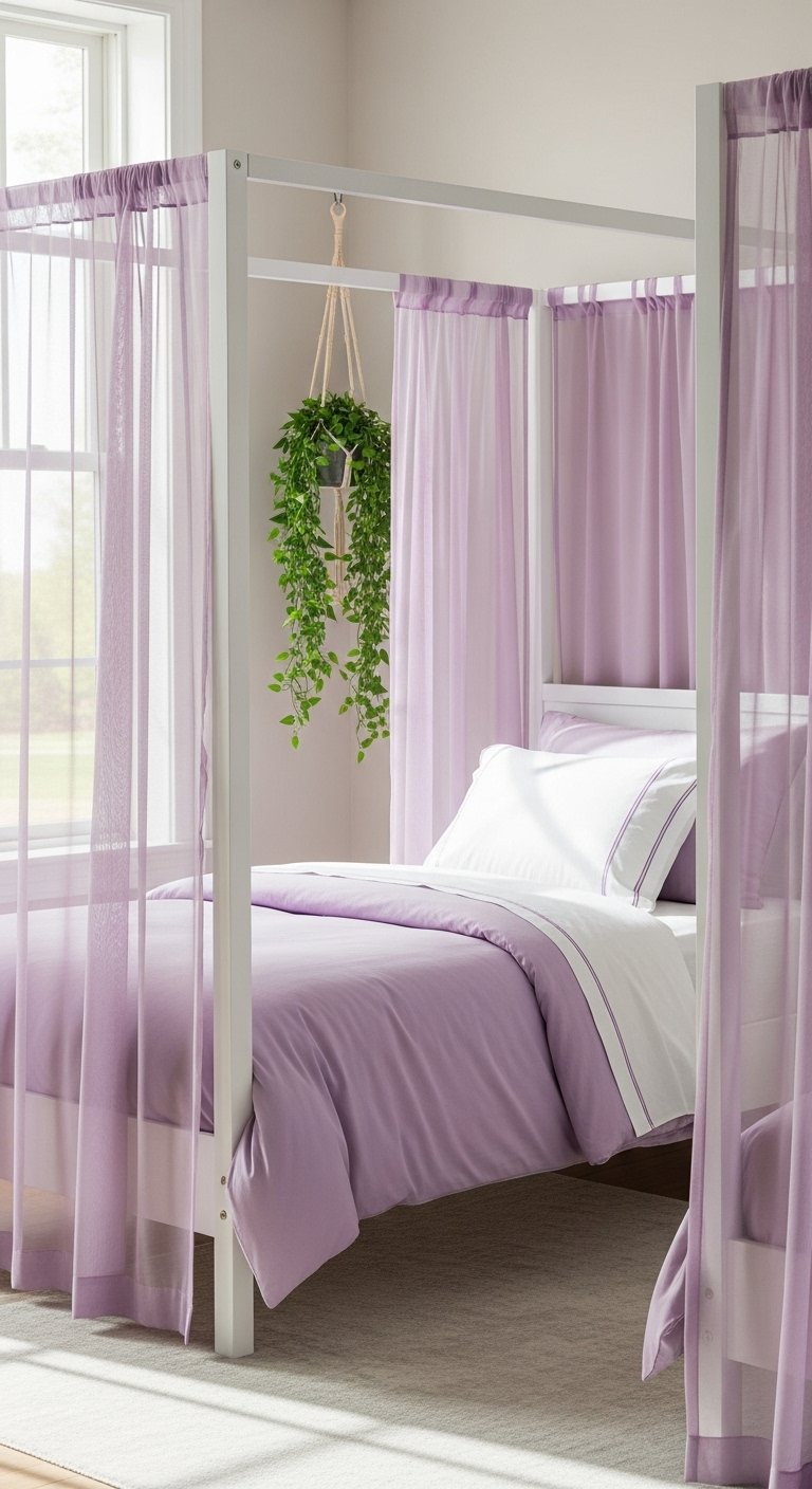 I installed a structured canopy frame and draped pale lilac fabric for a fairytale feel. Pair with a canopy bed netting purple and lightweight curtains. It’s dramatic without being fussy. Mistake to avoid: too-heavy fabrics. Choose sheers to keep air flow and avoid turning the bed into a hot box.