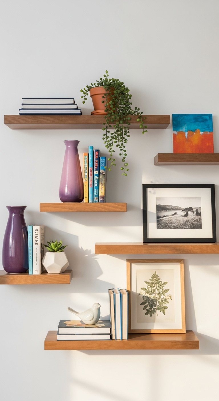 Shelves are where small purple pieces shine. I grouped items in odd numbers: a plum vase, a lavender book stack, and a framed print. Use white floating shelves for contrast. Mistake to avoid: filling every shelf—leave breathing room so each object reads intentional.