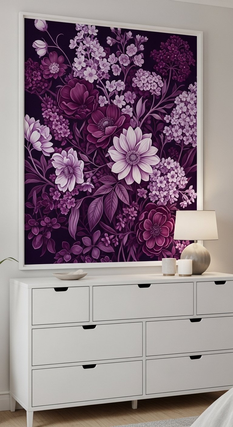 A single large print brings maturity to a girl’s room. I chose a floral piece with mauve, plum, and cream. Try searching for purple wall art prints. Mistake to avoid: mixing scale wrongly—large art needs clear wall space; don’t overcrowd with tiny frames.