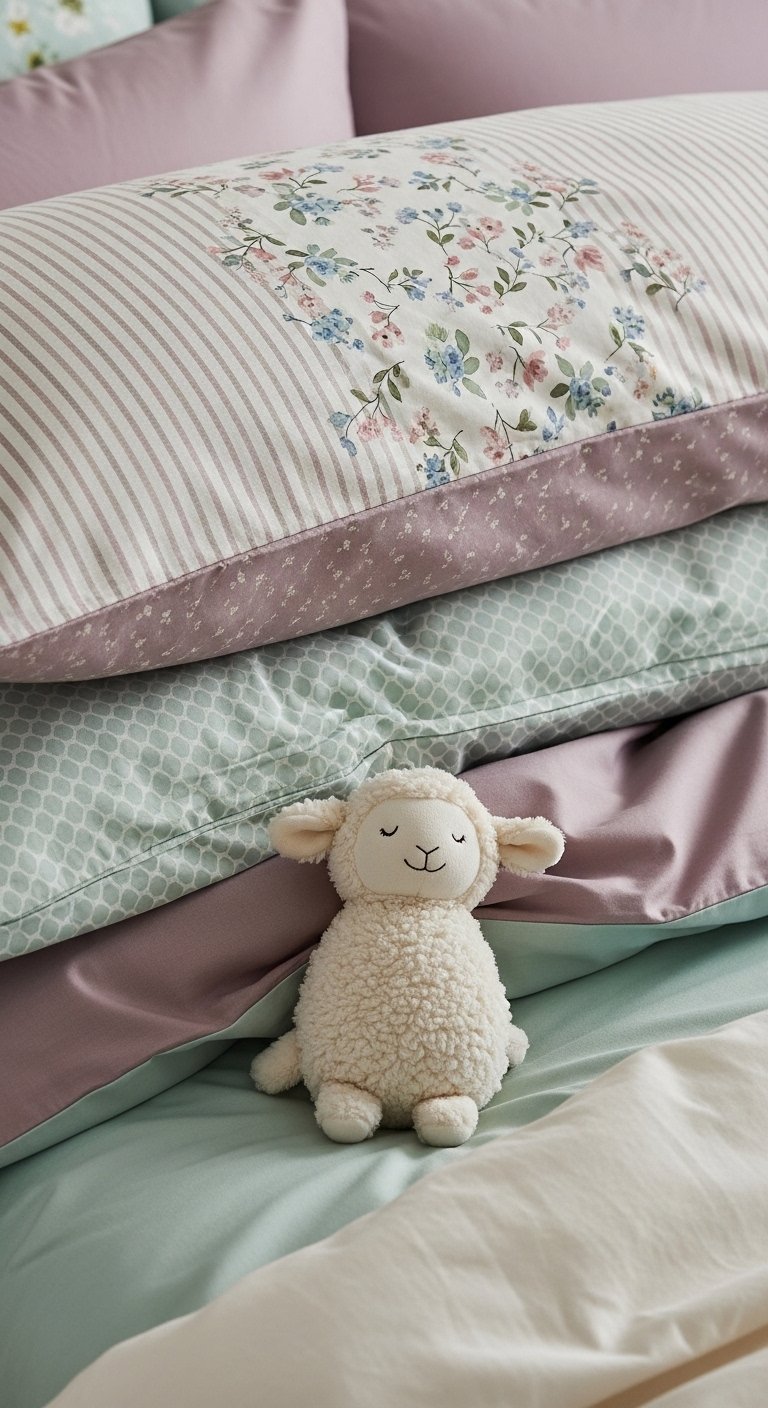 I mixed mauve florals with mint stripes for a playful palette. A purple throw blanket anchors the bed. Keep scale varied—large pattern, medium, and a small repeat. Mistake to avoid: same-scale patterns. That flattens the look. Vary sizes for visual interest and better texture play.