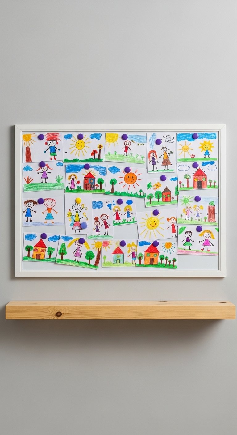 This is one of my favorite under-used ideas: a framed magnetic board lets kids display rotating art. Use magnetic dry-erase panels and purple clips. It keeps artwork tidy and celebrates creativity. Mistake to avoid: making it too high—mount at child eye-level so they can change displays independently.