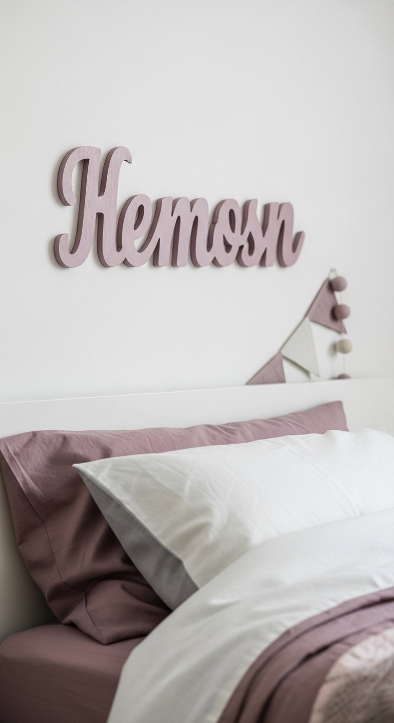 A monogram sign makes a room feel owned. I used a hand-painted wooden name plaque in soft plum hung above the bed. Try custom name signs. Mistake to avoid: oversized letters—keep them about one-third of the bed width for balance.